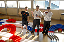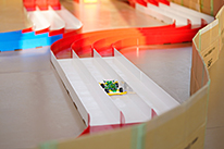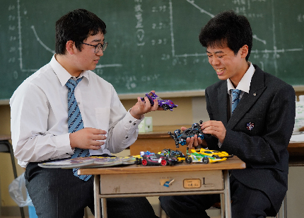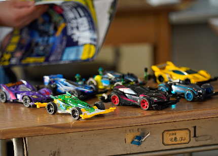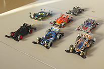 機械工作部では、モーターと単三電池2本で走るプラモデル『ミニ四駆』を作り、コース走行しています。モーター、タイヤ、ホイール、ギヤ比、マシンの前後に付けるローラー等を何種類もある改造パーツからコースに合わせて組合わせて、自分のオリジナルマシンを作ります。パーツの組合せ方は∞(無限大)です!
