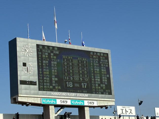 そして運命の後半戦、後半5分に近大にトライとゴールを決められ1点産に詰め寄られるも、26分に聖光学院がトライを決めて得点は18対12となります。
