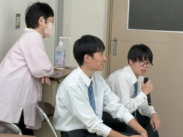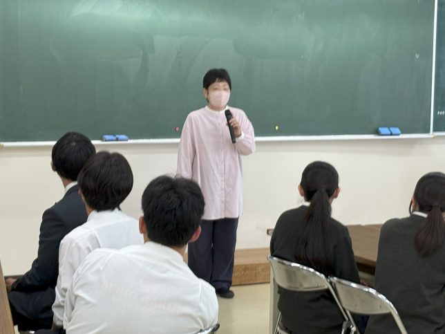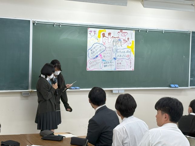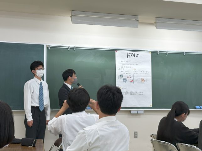 10月10日(金)に伊達市社会福祉協議会の佐藤様、齋藤様・福島県学校給食会の川本様にお越しいただき、3年生福祉探究コースを対象に「ハムとんず食堂の振り返り授業」を行いました。ハムとんず食堂での役割ごとにグループをつくり、各班で発表を行いました。
