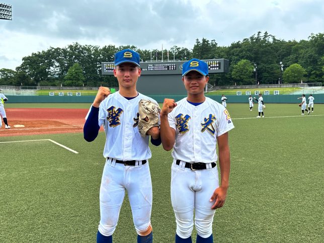 7回表一死から高野君が四球を選ぶと、1番の竹田一遥君が右中間を深々と破る貴重なタイムリー三塁打を放ちます。続く佐山瑞來君がスクイズを決めてこの回2点目を挙げて完全に主導権を握ります。聖光打線は8回も萩原大幹君、9回にも菊地君のタイムリーで1点ずつを奪い、合計6得点。日大東北の投手陣を完全に攻略して試合を決めました。