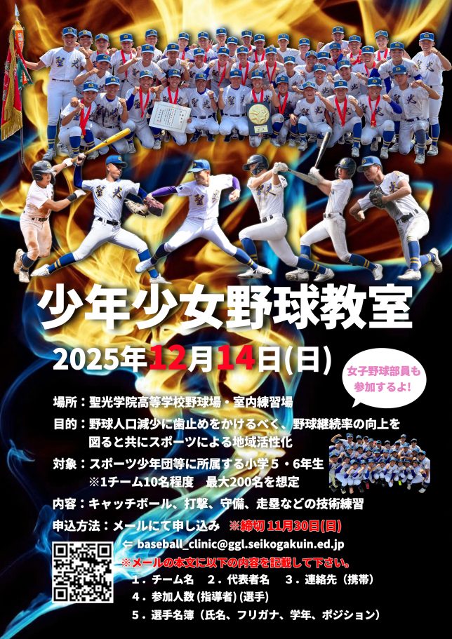 メールにてお申し込みください(締め切り11月30日(日)) baseball_clinic@ggl.seikogakuin.ed.jp