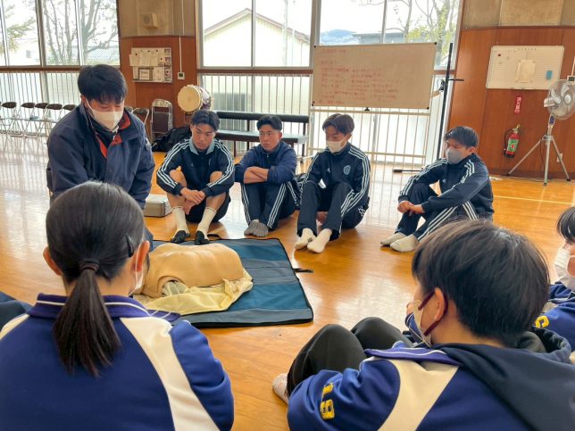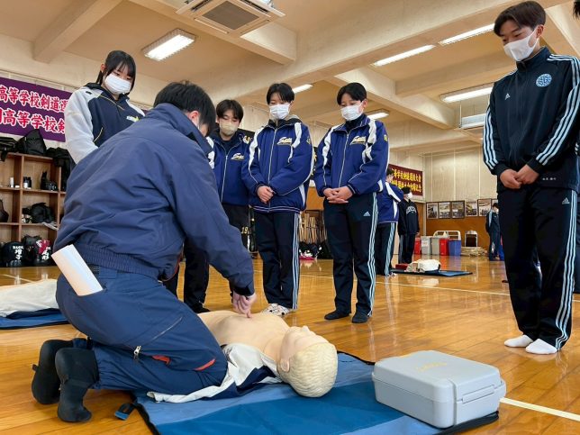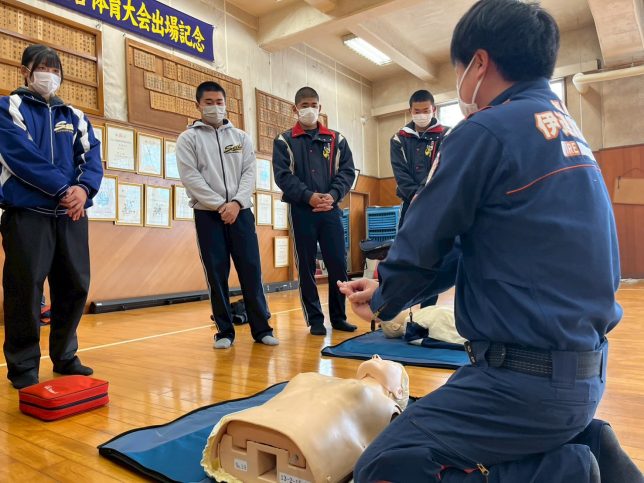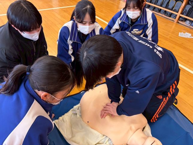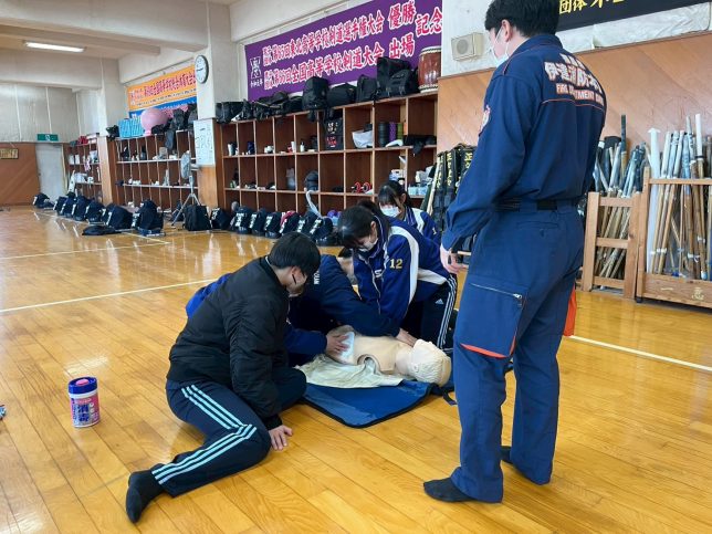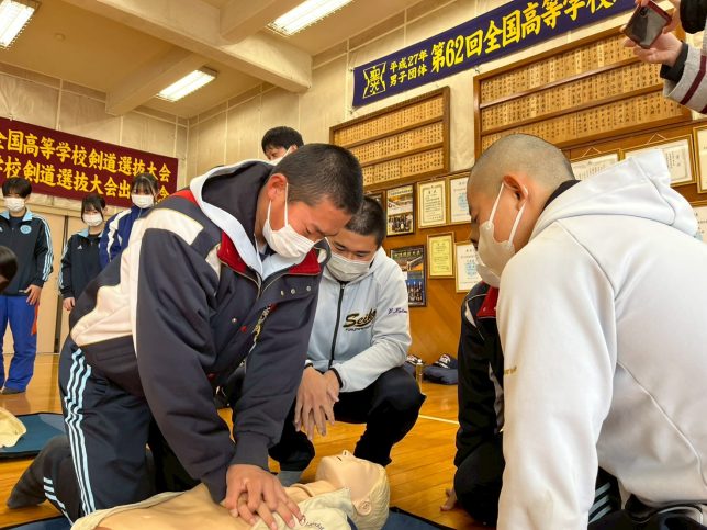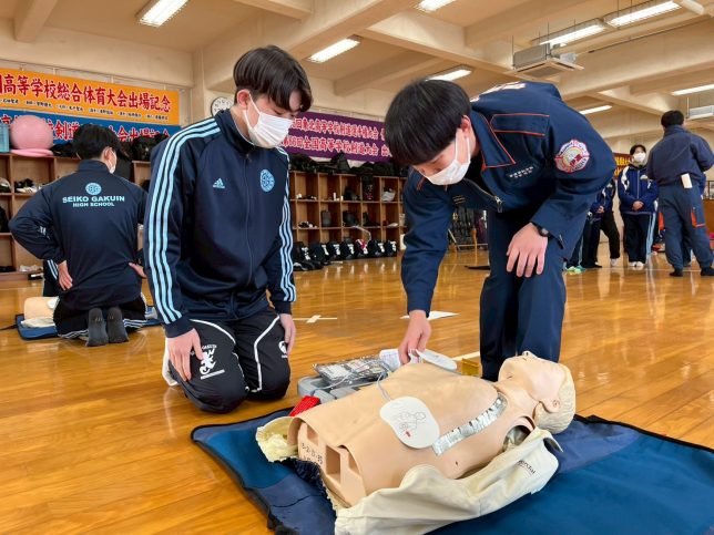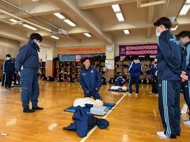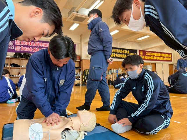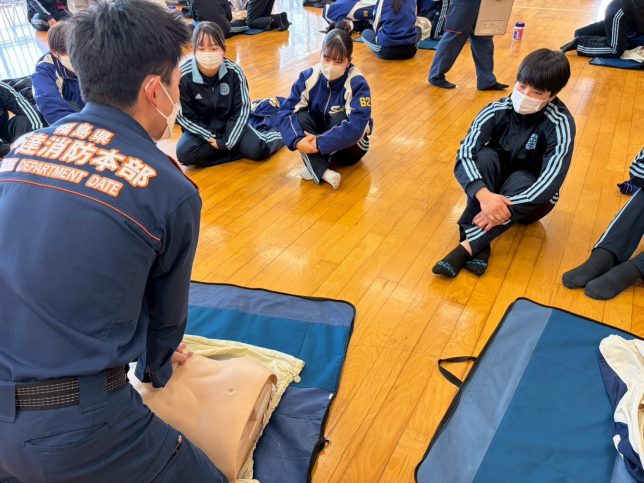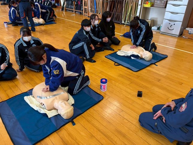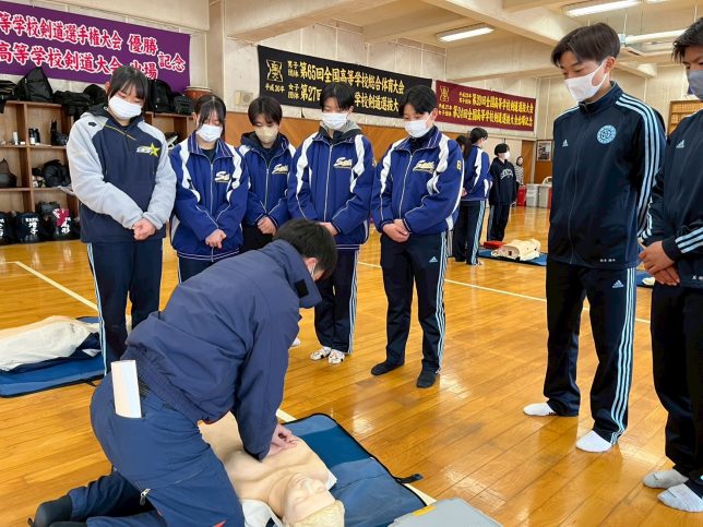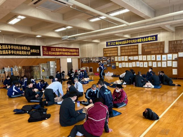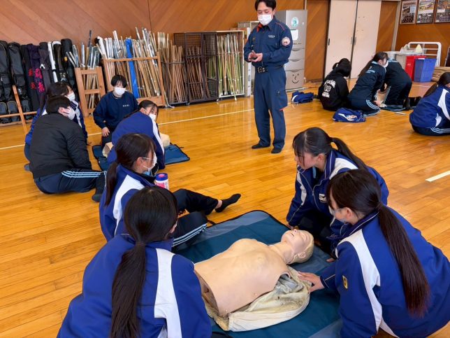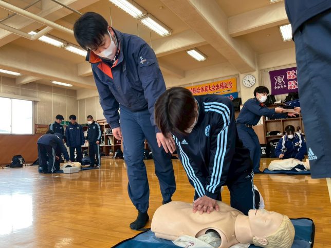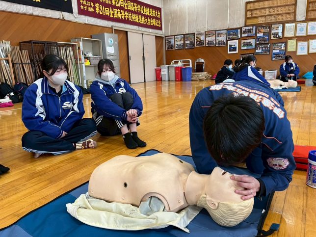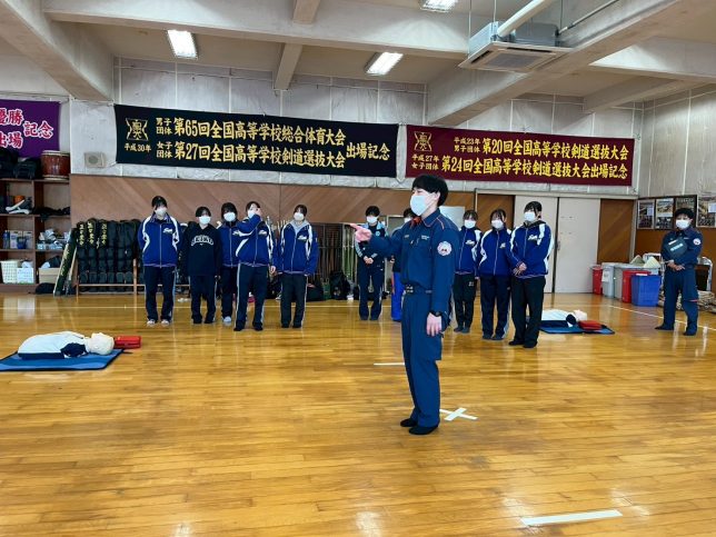 「もし目の前で仲間が倒れたら?」「その場に居合わせたら・・・」「迷わず動く」ことの大切さを再認識し、生徒たちは、署員の方のアドバイスを真剣な表情で聞き入り、一つひとつの動作を確認していました。スポーツを探究する者として、技術や体力だけでなく、周囲の安全を守る「心の強さ」も養えた貴重な時間となりました。