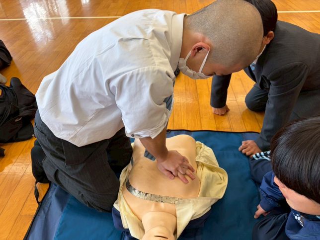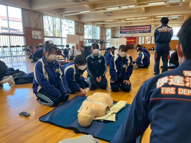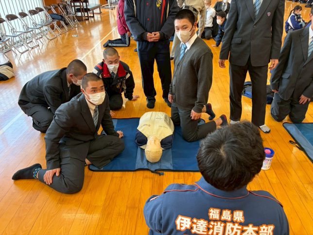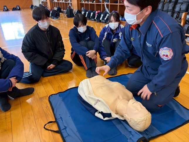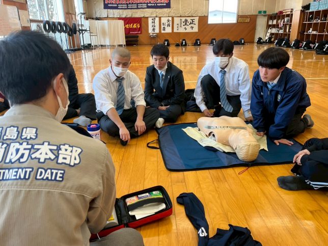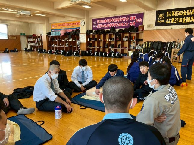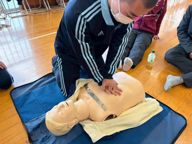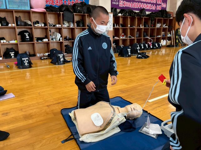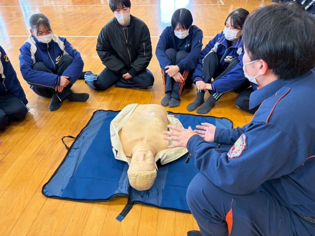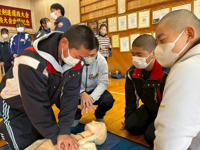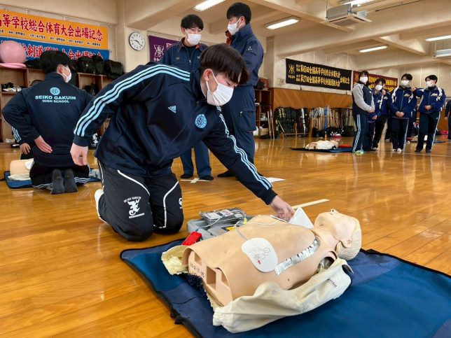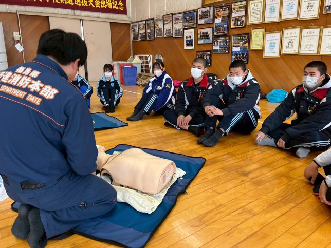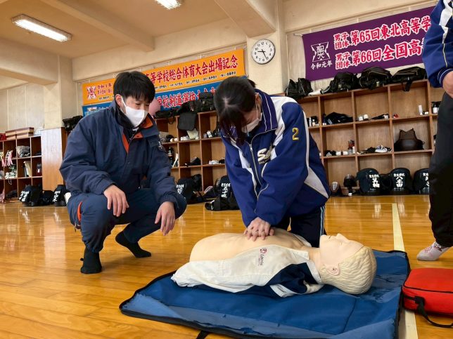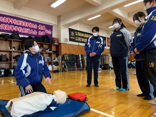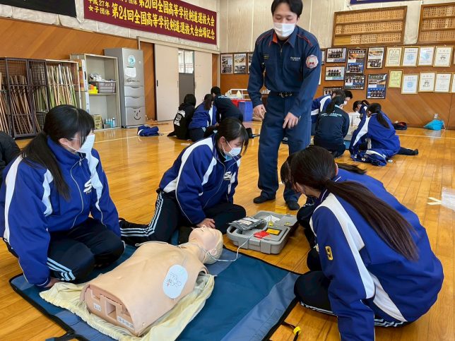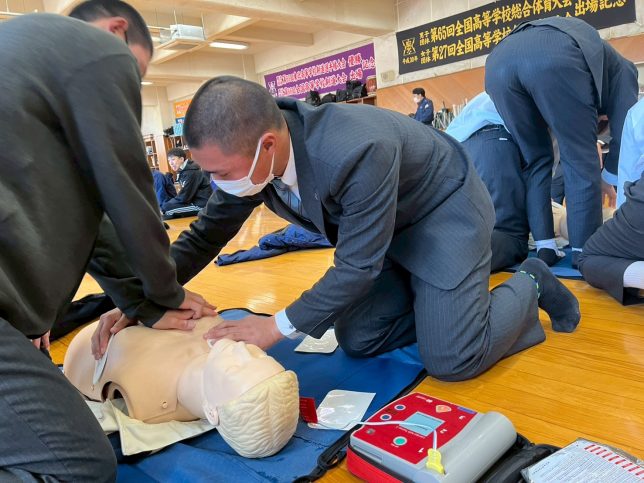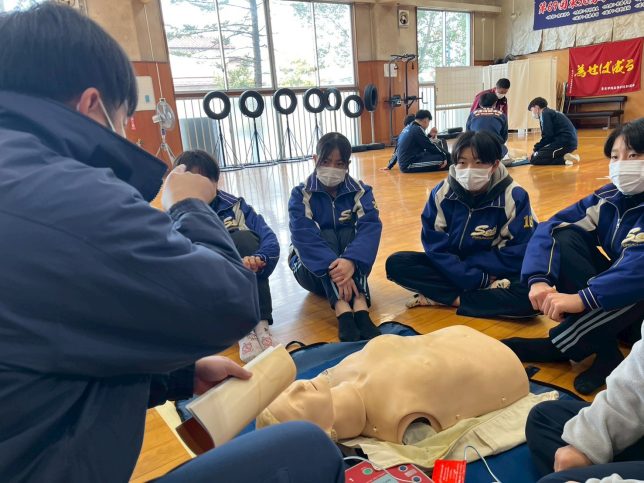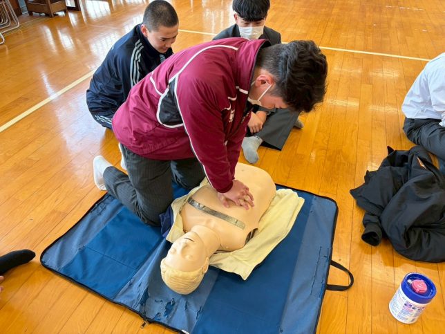 「もし目の前で仲間が倒れたら?」「その場に居合わせたら・・・」「迷わず動く」ことの大切さを再認識し、生徒たちは、署員の方のアドバイスを真剣な表情で聞き入り、一つひとつの動作を確認していました。スポーツを探究する者として、技術や体力だけでなく、周囲の安全を守る「心の強さ」も養えた貴重な時間となりました。