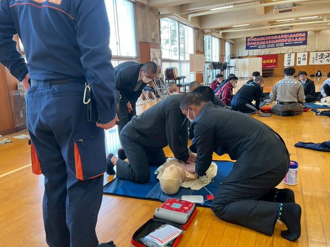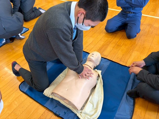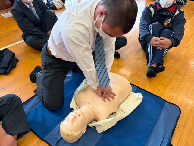 講習では、地元の消防署から署員の方々をお招きし、胸骨圧迫(心臓マッサージ)の方法やAEDの使い方について、実習を中心にじっくりと学びました。